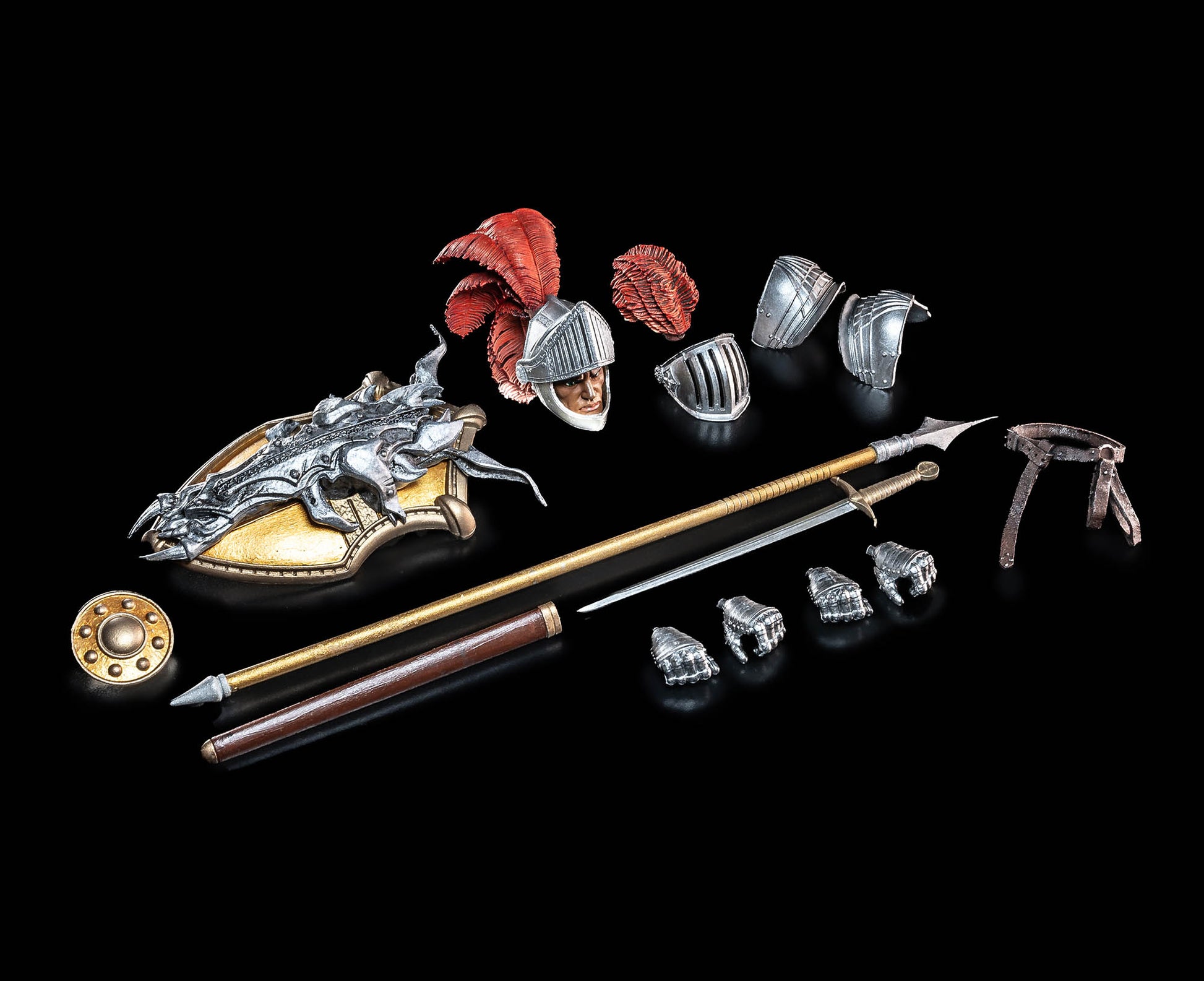 This figure will include a pair of removable visors and helmet plumes, extra hands, removable shoulder armor, sword with scabbard, spear, and the very special Shield Horseman accessory!